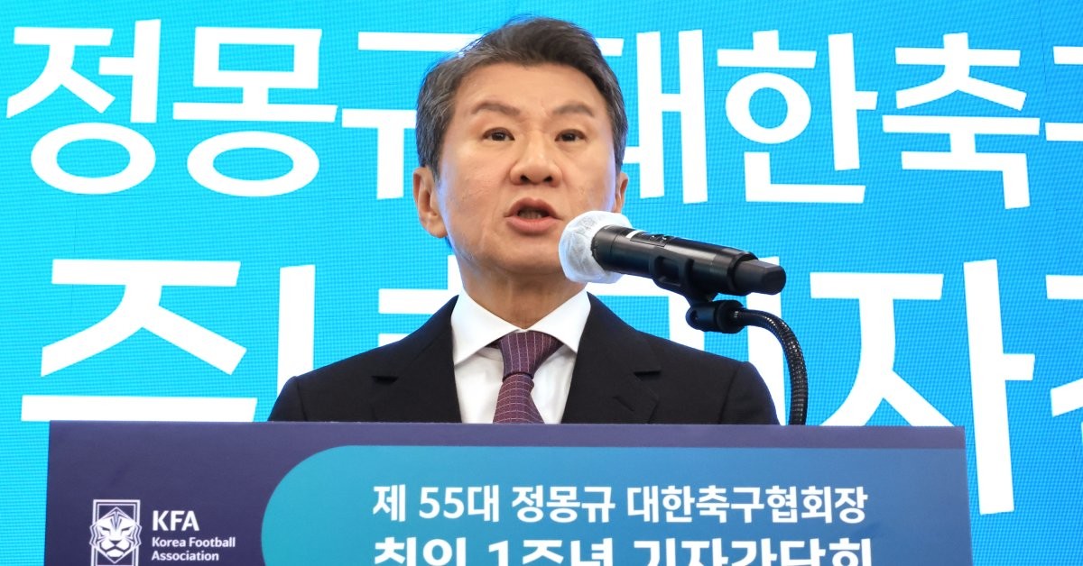 간담회에서는 팬심 이탈과 흥행 부진에 대한 질문도 나왔다. 작년 11월 국내에서 열린 두 차례 평가전에서 관중석 절반 이상이 빈 채로 끝났다. 정 회장은 홍명보 감독 선임 과정의 공정성 논란, EPL 무대를 떠난 손흥민에 대한 관심도 저하 등 여러 요인이 복합적으로 작용한 결과라고 짚었다.