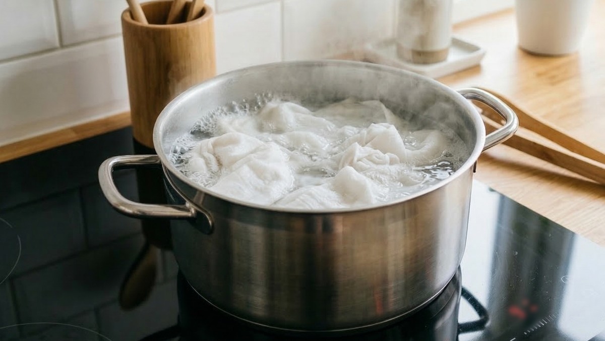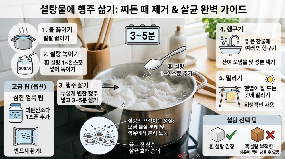 먼저 냄비에 물을 넣고 팔팔 끓인다. 물이 충분히 끓기 시작하면 설탕 한두 스푼을 넣어 녹여준다. 이후 누렇게 변한 행주를 넣고 약 3~5분 정도 끓여주면 된다. 이렇게 하면 행주에 배어 있던 찌든 때가 서서히 물에 풀려나오면서 한층 깨끗해진다.
