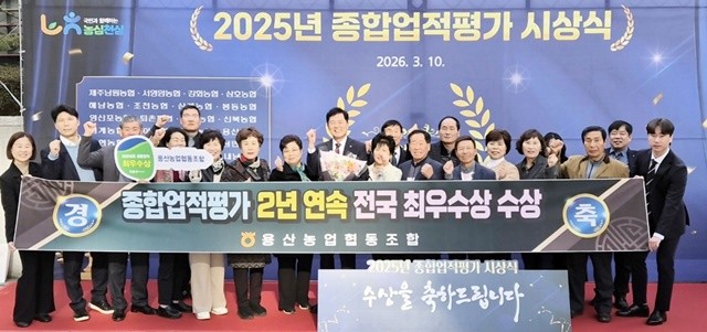 용산농협(조합장 박철환)은 “지난 10일 농협중앙회 본부 대강당에서 열린 시상식에서 ‘2025년 종합업적평가 최우수상’과 ‘클린뱅크 금 등급’을 동시에 수상했다”고 12일 밝혔다.