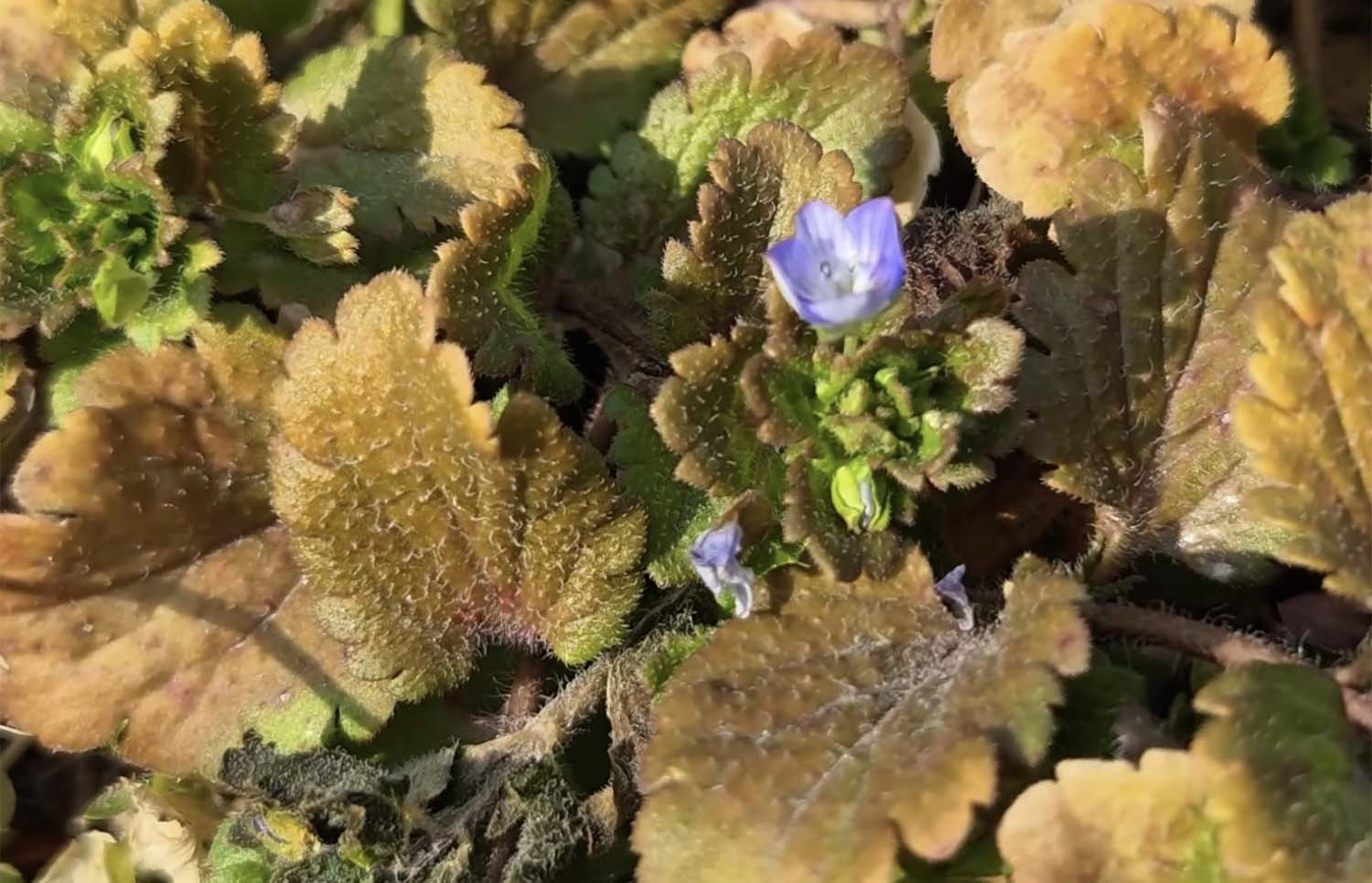 꽃은 3~5월 사이 잎겨드랑이에 한 송이씩 달리지만, 남부 해안과 일부 섬 지방에서는 겨울에도 개화한다. 지름은 8~10mm에 불과하지만 연보랏빛 바탕에 짙은 청색 줄무늬가 굵고 선명해 실제보다 훨씬 도드라져 보인다. 꽃잎은 네 장처럼 보이지만 사실 하나로 붙은 통꽃이어서 살짝 건드리면 통째로 힘없이 떨어진다. 자연에서 파란색 꽃을 만나기란 쉬운 일이 아니다. 달개비나 꽃마리, 현호색, 용담 정도가 떠오를 만큼 파란 꽃은 귀하다. 식물학자들은 서식 환경이 열악할수록 꿀벌을 유인하기 위해 푸른색 꽃을 피우는 경향이 있다고 설명한다.