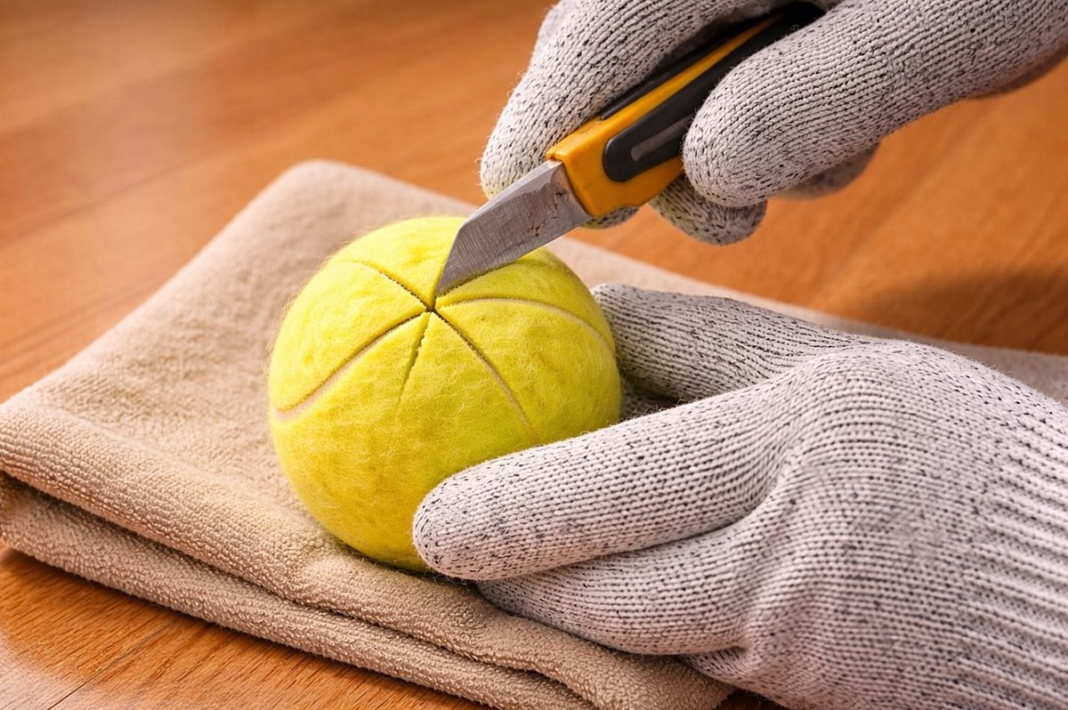 테니스공을 자를 때는 무엇보다 안전이 중요하다. 공은 둥글고 미끄러워 손으로 쥔 채 바로 칼질하면 날이 빗나가기 쉽다. 따라서 수건 위에 올려 굴러가지 않게 고정하거나, 두꺼운 장갑을 낀 손으로 단단히 잡고 작업하는 것이 좋다.