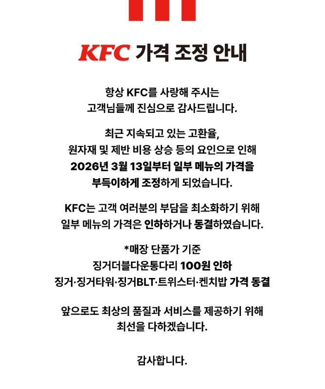 가격 인상의 주된 배경으로는 대외 경제 여건 악화가 지목된다. 지속되고 있는 고환율 현상은 수입 의존도가 높은 원재료 수급 비용을 크게 끌어올렸다. 닭고기와 밀가루, 식용유 등 핵심 원자재 단가 상승에 더해 인건비와 임대료를 포함한 전반적인 운영 비용이 임계점에 도달했다는 분석이다. KFC 측은 내부적인 비용 절감 노력만으로는 경영 부담을 상쇄하기 어려운 상황에 이르러 부득이하게 일부 메뉴의 가격을 조정하게 되었다고 설명했다.