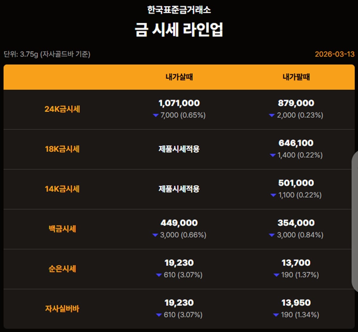대한민국 자본시장을 종합적으로 관장하는 한국거래소 기준 이날 오후 금가격은 다음과 같다.