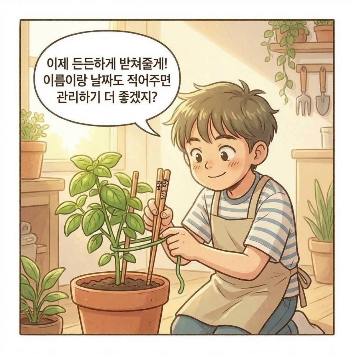 나무젓가락의 가장 직관적인 용도는 어린 식물을 위한 '맞춤형 지지대'다. 파종 후 갓 싹을 틔운 모종이나 줄기가 얇은 다육식물 등은 자그마한 외부 충격이나 자체 무게에도 쉽게 옆으로 쓰러지기 일쑤다. 이때 나무젓가락을 식물 옆에 깊숙이 세우고 원예용 빵끈이나 부드러운 실로 느슨하게 묶어주면, 식물이 올곧게 위로 성장할 수 있는 튼튼한 버팀목이 된다.
