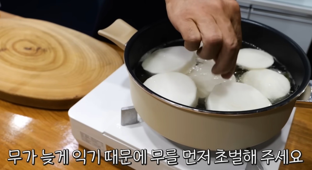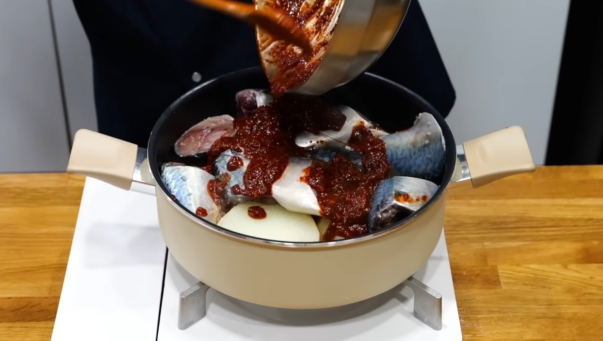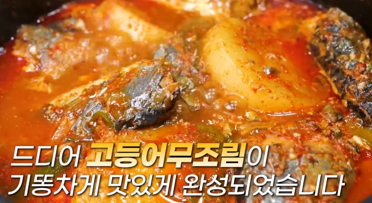 유튜브 '김대석 셰프TV'에 따르면, 레시피는 다음과 같다. 생고등어 세 마리를 깨끗하게 씻어 천일염 한 스푼으로 밑간을 한다. 이후 냄비에 물 600ml와 다시마 두 조각을 넣고 끓인다. 무 반 개를 2cm 두께로 길쭉하게 썰어 육수에 넣어 10~12분간 익혀준다.