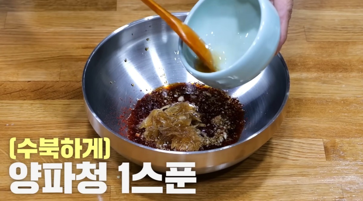 다음은 양념장을 만들 차례다. 고춧가루 세 스푼, 다진 마늘 한 스푼, 다진 생강 세 스푼, 진간장 세 스푼, 국간장 두 스푼, 미림 두 스푼을 넣는다. 마지막으로 양파청 한 스푼을 추가하면 된다. 양파청이 없을 경우에는 설탕 한 스푼 또는 물엿 한 스푼으로 대체가 가능하다. 이후 모든 재료를 섞어 양념장을 완성한다.