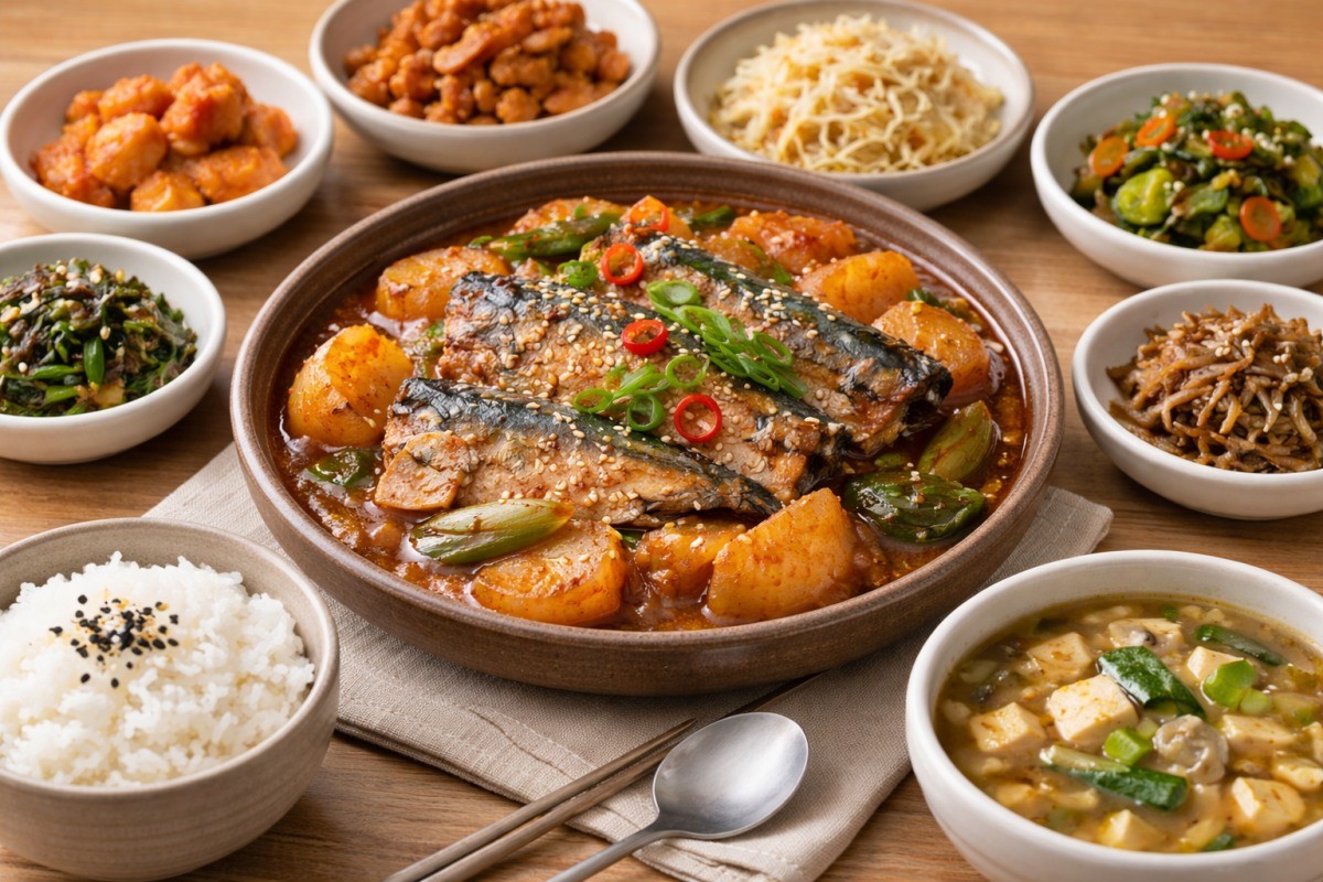 숙주나물과 콩나물무침도 있다. 하얗게 무친 나물류는 아삭한 식감을 더해주며, 조림의 자극적인 맛을 씻어내 준다. 생김에 양념이 잘 밴 무와 고등어 살을 떼어 따뜻한 밥과 함께 싸 먹으면 또 다른 별미가 탄생한다.