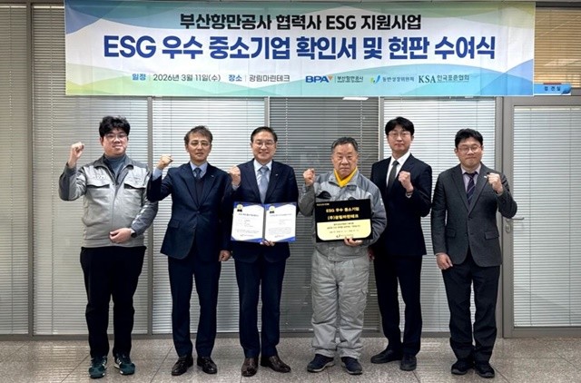 부산항만공사(BPA·사장 송상근)는 11일 부산 강서구 ㈜광림마린테크 본사에서 ‘2025년 협력사 ESG 지원사업’ 우수 중소기업 현판 수여식을 개최했다고 밝혔다.