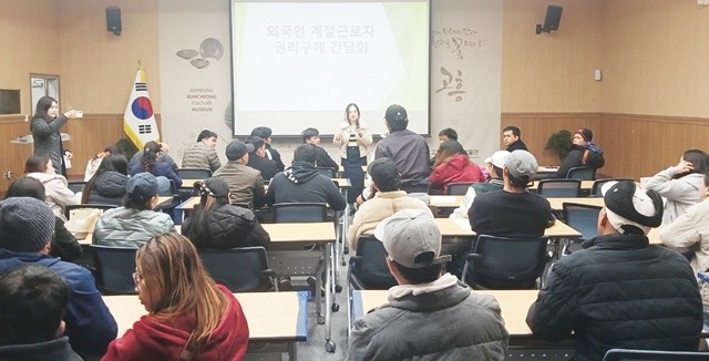 [위키트리 광주전남취재본부 노해섭 기자] 고흥군(군수 공영민)은 지난 12일 고흥분청문화박물관 강당에서 관내 외국인 계절근로자의 인권 보호와 실질적인 권리구제를 위해 ‘외국인 계절근로자 권리구제 간담회’를 개최했다고 밝혔다.