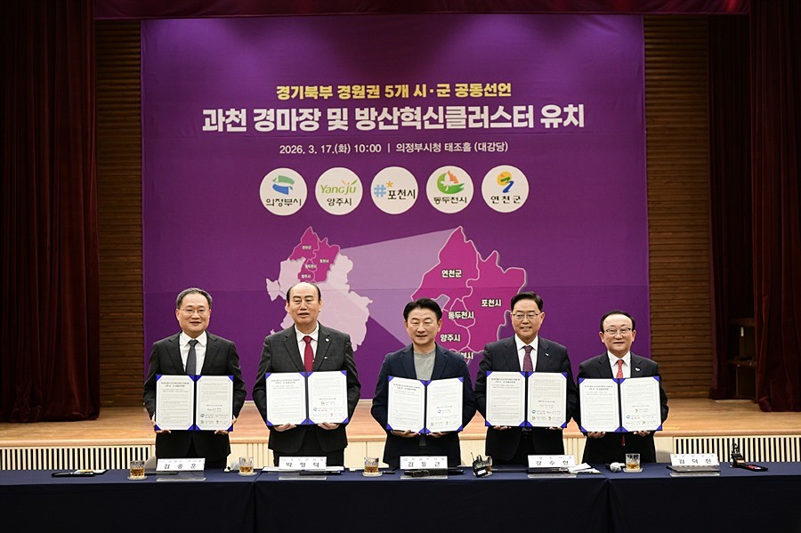 경기 포천시(시장 백영현)는 17일 의정부시청 태조홀에서 경기북부 경원권 5개 시군(포천·의정부·양주·동두천·연천)과 함께 ‘과천경마공원 이전 및 방산혁신클러스터 유치’를 위한 공동선언식을 개최했다.