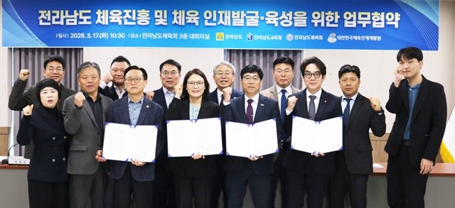 전남도는 17일 전남도체육회에서 전남도교육청, 대한민국체육인재개발원, 전남도체육회와 공동으로 ‘전남 체육진흥 및 체육인재 발굴·육성을 위한 업무협약(MOU)’을 체결했다고 밝혔다.
