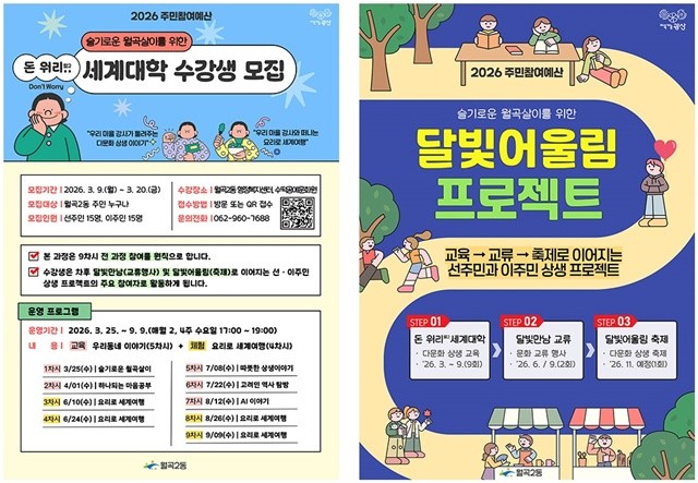 월곡2동은 17일 선주민과 이주민의 상생을 위한 3단계 프로젝트 ‘달빛 어울림’의 첫 번째 프로그램인 ‘슬기로운 월곡살이를 위한 돈 워리(월곡2동) 세계대학’을 본격 가동한다고 밝혔다.
