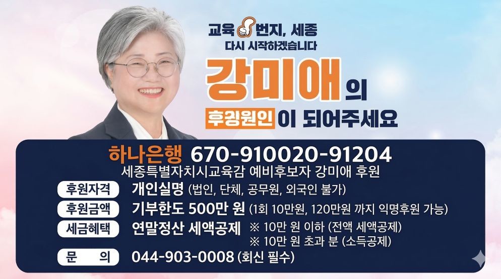 강 예비후보는 “아이들이 학교 가는 길이 행복하고 학교에서 배우며 꿈을 키울 수 있을 때 세종의 미래도 함께 밝아진다”며 “세종시민과 교육 가족의 작은 정성이 아이들의 미래를 밝히는 마중물이 될 것”이라고 말했다. 출처는 강미애 예비후보 측 발표다.