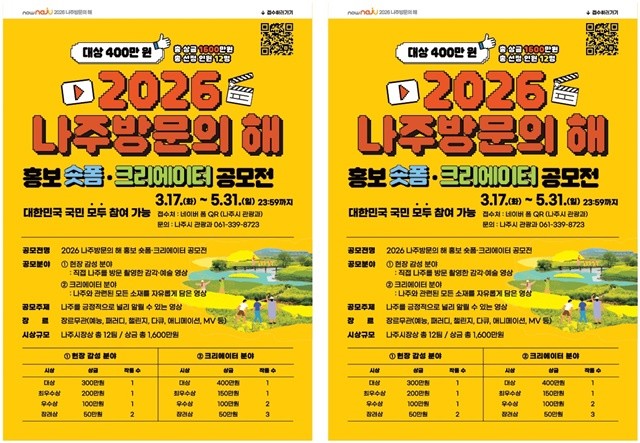19일 나주시는 “나주의 다양한 문화·관광 매력을 전국에 효과적으로 알리기 위해 총상금 1,600만 원 규모의 ‘2026 나주 방문의 해 홍보 숏폼 크리에이터 공모전’을 오는 5월 31일까지 개최한다”고 밝혔다.