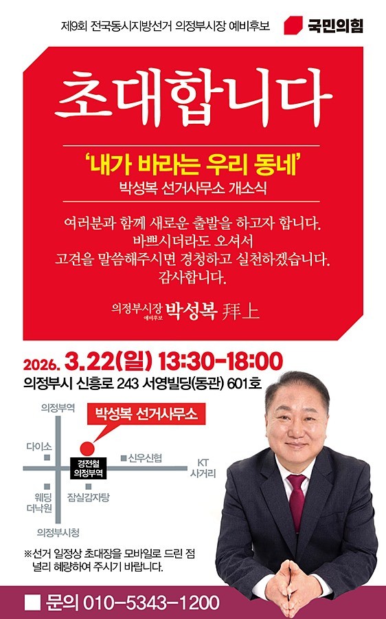 박성복 의정부시장 예비후보는 오는 22일(일) 오후 1시 30분부터 의정부시 신흥로 243 서영빌딩 동관 601호에서 시민과 직접 소통하는 행사‘내가 바라는 우리동네’를 개최한다.