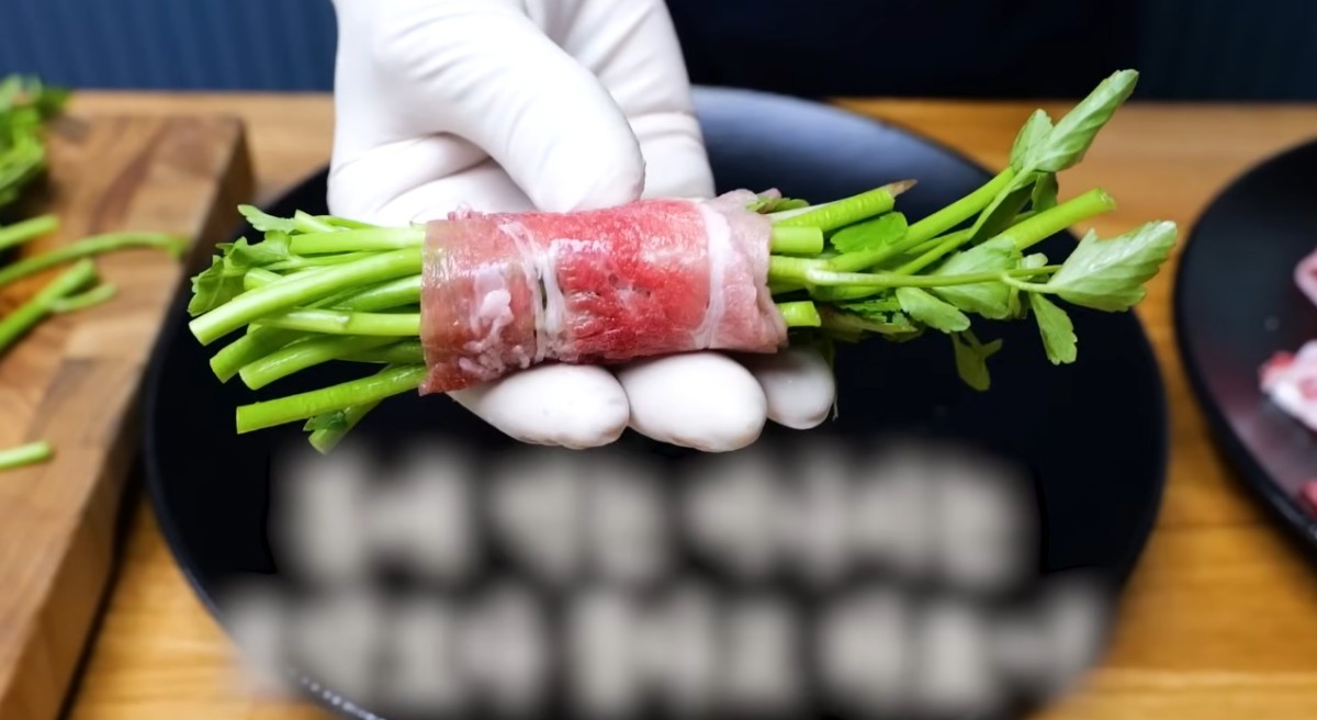 미나리는 이파리를 떼고 깨끗하게 씻은 후 7~8cm 간격으로 썬다. 준비한 대패 삼겹살 200g을 접시에 펼친 후 미나리 한줌과 우엉을 삼겹살 중간에 넣고 돌돌 말아주면 된다.