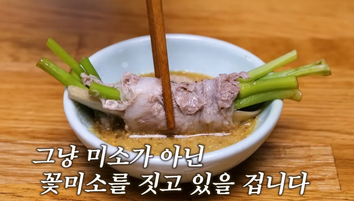미나리 삼겹살 말이를 겨자소스에 찍어 먹으면 미나리의 향긋함과 우엉의 아삭함을 동시에 느낄 수 있다.