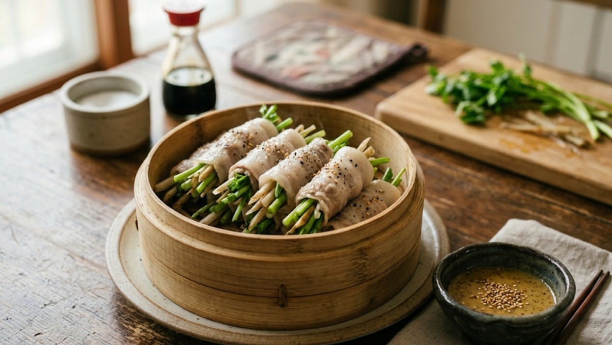 삽겹살말이 찜의 핵심은 촉촉함이다. 특히 이를 결정짓는 건 찜기 내부의 증기 밀도로, 찜기에 처음부터 재료를 넣고 뚜껑을 닫은 채 가열하는 것이 아니라, 물이 끓어 김이 모락모락 올라오는 시점을 확인한 뒤 뚜껑을 닫는 것이 중요하다.