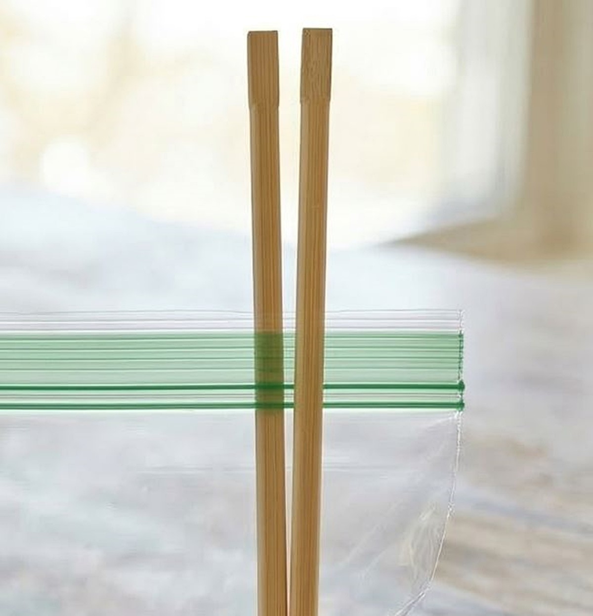 이렇게 하면 벌어진 젓가락 사이에 지퍼백의 밀봉 부위를 끼우기 쉬워진다. 이후 내용물을 담아 둔 지퍼백의 입구 쪽 밀봉선에 갈라 둔 나무젓가락을 끼운 다음, 한쪽 끝에서 다른 쪽 끝으로 부드럽게 밀어 주면 된다. 그러면 손으로 여러 번 눌러 맞출 때보다 훨씬 안정적으로 밀봉선이 맞물리면서 잘 닫히지 않던 지퍼백이 순식간에 꽉 잠긴다.