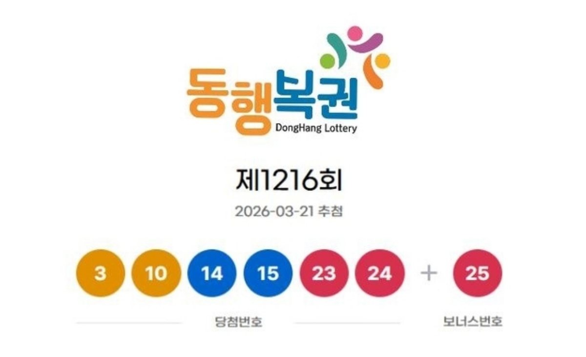 복권수탁사업자인 동행복권은 3월 21일 열린 제1216회 로또복권 추첨에서 1등 당첨번호가 ‘3, 10, 14, 15, 23, 24’로 뽑혔다고 밝혔다. 2등 판가름의 기준이 되는 보너스 번호는 ‘25’로 정해졌다.