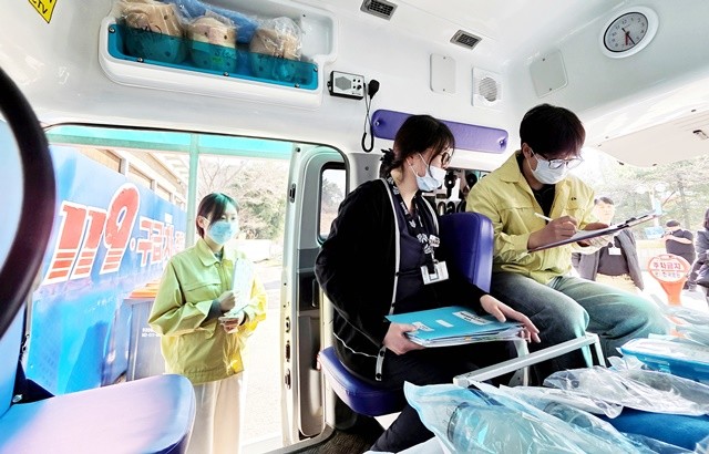 [위키트리 광주전남취재본부 노해섭 기자]봄철 크고 작은 산불과 화재가 잇따르고 있는 가운데 23일 광주시 북구보건소 보건행정과 의약관리팀 직원들이 운암동의 한 종합병원에서 응급환자 발생시 긴급출동에 대비 의료장비 구축 여부 등 관리실태 점검을 하고 있다.