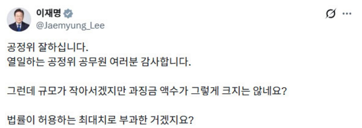 현직 대통령이 특정 기업의 공정위 제재 건을 SNS에서 직접 언급하며 과징금 수준에 의문을 제기한 것이어서 온라인에서 빠르게 확산됐다.
