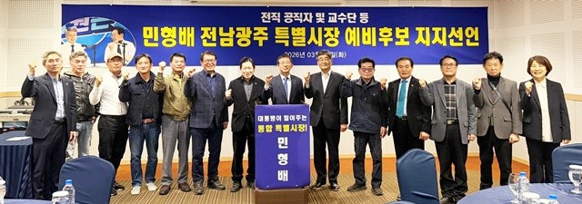 26일 민형배 경선사무소(민심캠프)에 따르면, 지난 24일 광주 홀리데이인호텔 컨벤션홀에서 전직 공직자와 교수진 125명이 민 예비후보 지지를 선언했다. 이날 자리에는 조영무 전 광주광역시의회사무처장, 이인곤 전 목포부시장, 이병택 전 전남대 공대학장, 정희남 전 광주교육대학교 대학원장 등이 대표로 참석했다. 이들은 민 후보가 AI 및 에너지 산업을 통한 일자리 창출 로드맵을 제시하며 '더 크고 강한 전남광주특별시'를 이끌 최적의 적임자라고 강조했다.