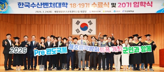 [위키트리 광주전남취재본부 노해섭 기자]전남 완도군이 지역 수산업의 미래를 책임질 핵심 인재 양성의 산실인 '한국수산벤처대학'의 수료식과 입학식을 성공적으로 개최하며 지속 가능한 해양 산업 도약의 발판을 다졌다.