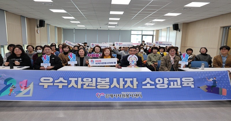 전북특별자치도 김제시는 김제시자원봉사센터가 지난 24일, 센터 2층 대회의실에서 김제시를 대표하는 우수자원봉사자 120여 명이 참석한 가운데 “2026 우수자원봉사자 소양교육”을 실시했다고 밝혔다.