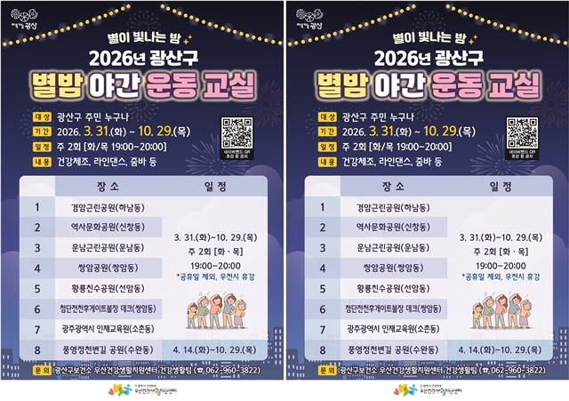 26일 광산구에 따르면, 남녀노소 누구나 무료로 참여할 수 있는 건강 체조 프로그램인 ‘별밤야간운동교실’이 오는 31일부터 10월 29일까지 운영된다. 바쁜 일상으로 낮 시간에 운동하기 어려운 직장인과 주민들을 위해 매주 화요일과 목요일, 주 2회 저녁 7시부터 8시까지 1시간 동안 진행된다.