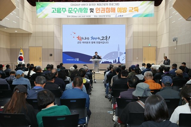 [위키트리 광주전남취재본부 노해섭 기자] 고흥군(군수 공영민)은 26일 군청 우주홀에서 외국인 계절근로자 제도의 안정적 운영을 위해 2026년 상반기 계절근로자 프로그램 고용주 교육을 실시하고, 근로환경 개선과 인권 보호를 위한 지원 대책을 추진하고 있다고 밝혔다.