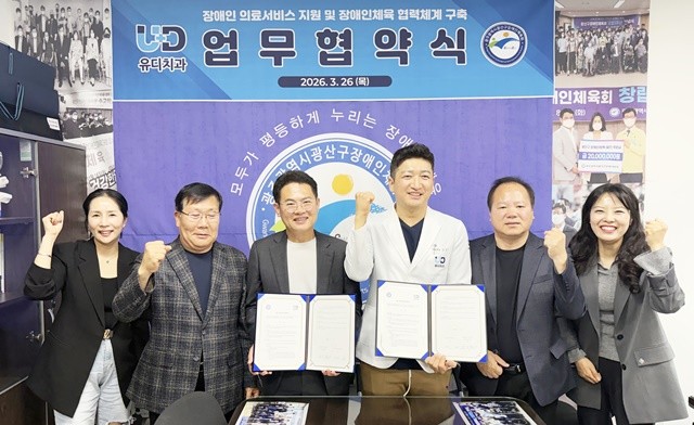 26일 광산구장애인체육회에 따르면, 체육회는 이날 유디수완치과의원(원장 신승우)과 장애인 체육인 의료복지 강화를 위한 업무협약(MOU)을 체결했다. 이번 협약은 장애인 체육인의 구강 건강을 체계적으로 관리하고 실질적인 의료 복지를 향상해, 이들이 보다 안정적인 환경에서 체육활동에 전념할 수 있도록 지원하기 위해 마련됐다. 양 기관은 상호 협력을 바탕으로 지역사회 장애인 체육 발전에 기여하기로 뜻을 모았다.