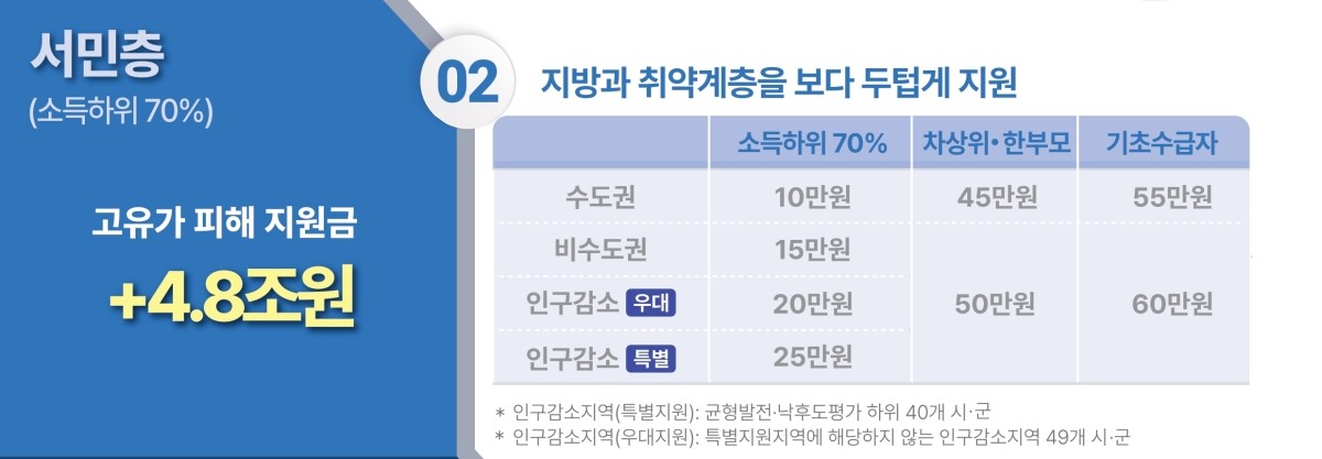 이어 소득 하위 70% 국민에게도 지역에 따라 금액을 달리 지급한다. 수도권은 10만원, 비수도권은 15만원, 인구감소우대지역은 20만원, 인구감소특별지역은 25만원이다. 정부는 고유가와 물가 상승 충격이 지방에 더 크게 미칠 수 있다는 점을 고려해 지역별 차등 지원 방식을 담았다고 설명했다.