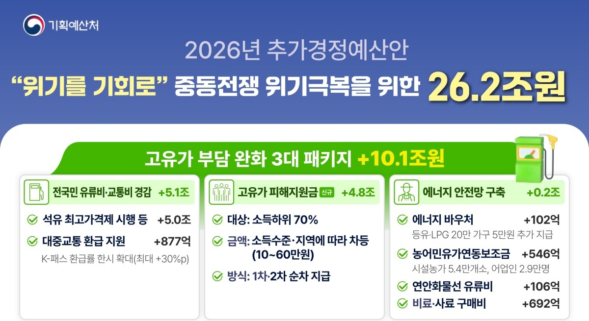 이번 추경안은 올해 새로 출범한 기획예산처가 내놓은 첫 추가경정예산안이다. 지난해 6월 이재명 정부 출범 이후 기준으로는 두 번째 추경이기도 하다. 정부는 이번 예산안의 공식 명칭을 ‘중동전쟁 위기 극복을 위한 2026년도 추경’으로 정했다.