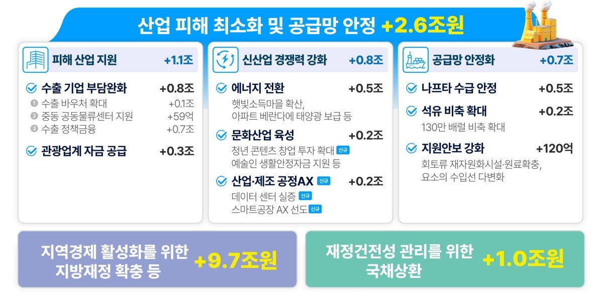 이번 추경 규모는 총 26조 2000억원이다. 정부는 고유가 부담 완화에 10조 1000억원, 민생 안정 지원에 2조 8000억원, 산업 피해 최소화와 공급망 안정에 2조 6000억원, 지방재정 보강 등에 9조 7000억원, 국채 상환에 1조원을 각각 편성했다.