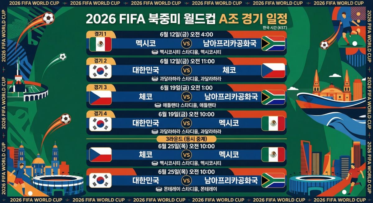 다음은 4월 1일 확정된 2026 북중미 월드컵 조별리그 A조 경기 일정이다.