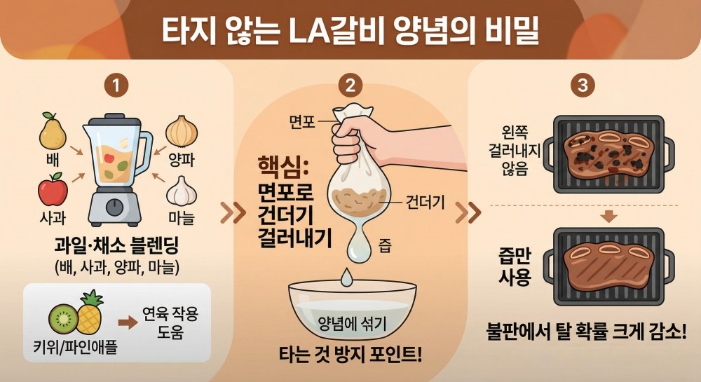 이때 중요한 핵심은 '건더기를 걸러내는 과정'이다. 믹서기에 간 재료를 그대로 간장 양념에 넣으면 구울 때 양념이 타기 쉽다. 따라서 면포를 이용해 즙만 짜서 사용해야 한다. 이렇게 하면 양념이 고기 표면에 고르게 스며들면서도 불판에서 탈 확률을 크게 줄일 수 있다. 실제로 많은 요리 전문가들도 갈비 양념에서 건더기를 제거하는 것을 포인트로 짚고 있다.