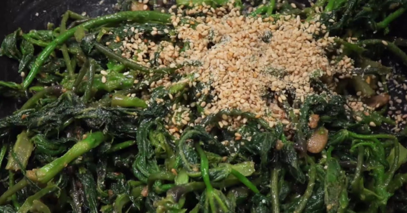 준비된 두릅에 양념을 넣고 가볍게 무쳐준다. 이때 손으로 조물조물 무치기보다는 젓가락이나 손끝을 이용해 살살 버무리듯 섞어야 두릅의 형태가 유지되고 식감도 살아난다. 마지막으로 통깨를 뿌려 마무리하면 완성된다. 간단한 과정이지만 재료의 상태와 손질, 양념의 균형이 맞아야 제대로 된 맛이 난다.
