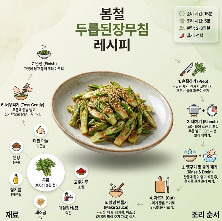 짧은 봄의 시간을 온전히 담아낸 두릅된장무침은 복잡한 조리 없이도 계절의 풍미를 그대로 느낄 수 있는 대표적인 제철 요리다. 손질과 데치기, 그리고 간단한 양념만으로 완성되는 이 한 접시는 봄 식탁을 가장 직관적으로 보여주는 메뉴로 자리하고 있다.