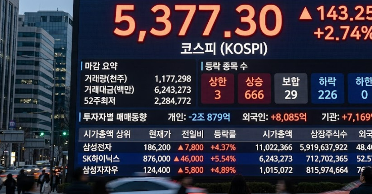 코스피 지수가 삼성전자와 SK하이닉스 등 반도체 대형주의 강한 반등에 힘입어 하루 만에 140포인트 이상 급등하며 5377.30선에 안착했다.