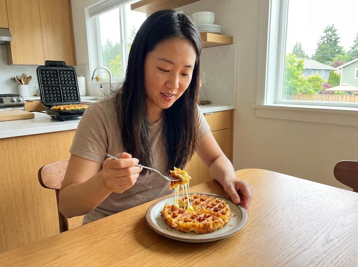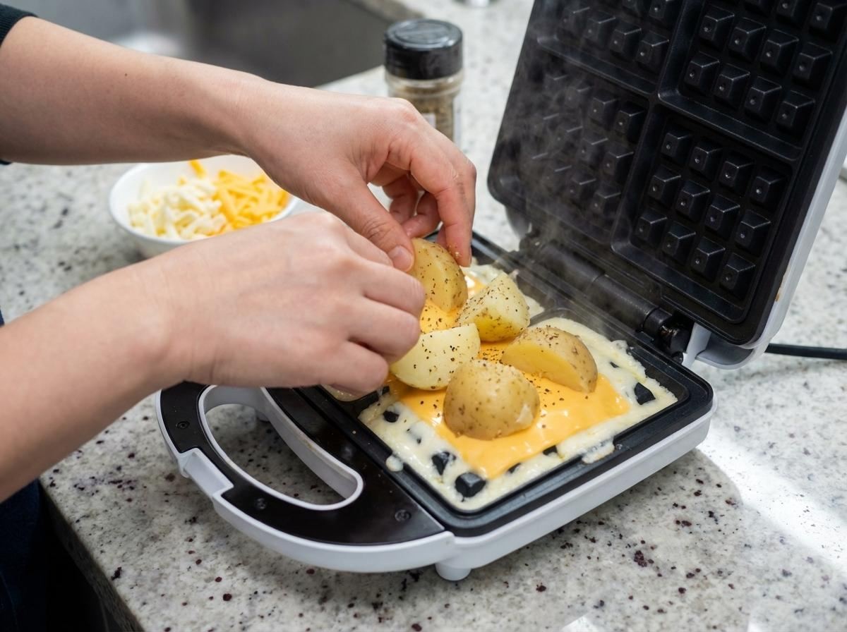 반대로 와플기 바닥에 치즈를 먼저 깔고 그 위에 감자를 올린 뒤 다시 치즈를 덮는 ‘크러스트형’ 방식은 겉면이 치즈로 코팅되면서 바삭함이 극대화된다. 체다치즈를 사용할 경우 녹으면서 기름이 나오기 때문에 감자 표면이 튀겨지듯 익는다. 모짜렐라만 사용할 경우에는 체다를 함께 섞는 것이 색감과 풍미를 높이는 방법이다.