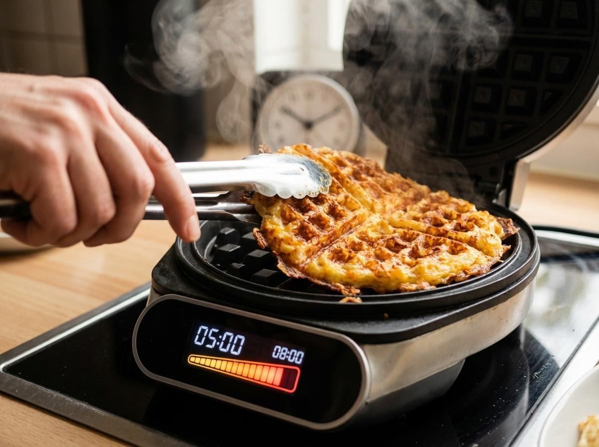 와플기 사용 전에는 반드시 충분한 기름 코팅이 필요하다. 감자의 전분과 치즈가 직접 닿기 때문에, 기름이 부족하면 쉽게 달라붙는다. 식용유나 버터를 양면에 고르게 발라주는 것이 안정적인 조리의 핵심이다.