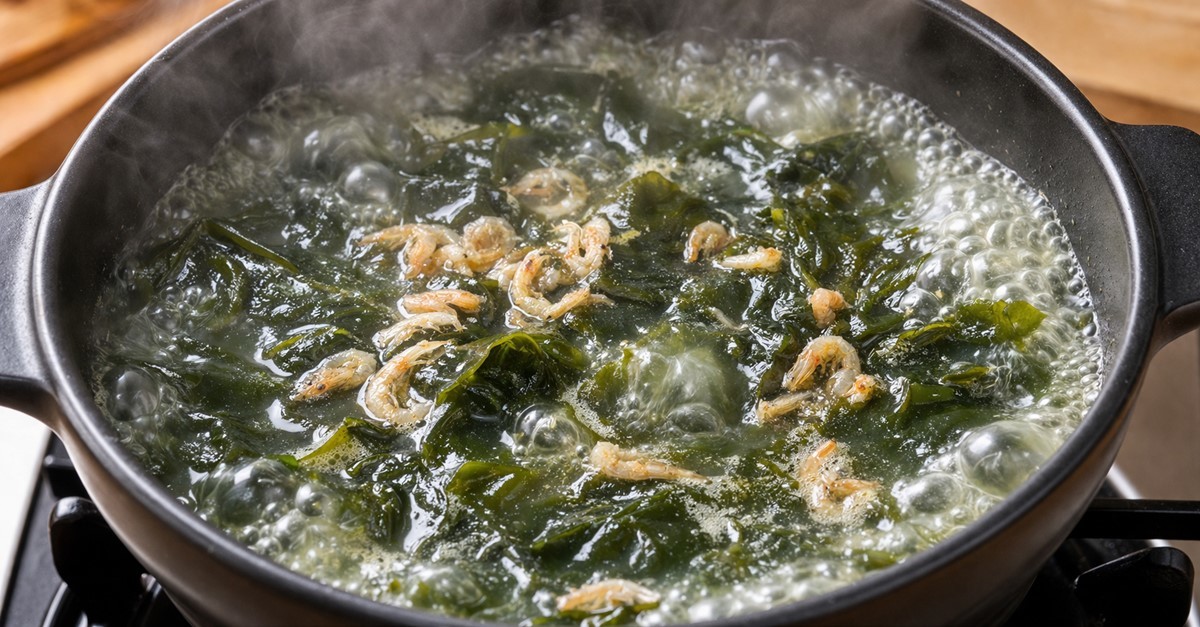 이 과정은 미역의 비린 향을 줄이고 고소한 맛을 끌어내는 중요한 단계이다. 이후 준비한 보리새우를 넣고 함께 볶아 주면 보리새우가 기름과 어우러지며 더욱 고소한 향을 내고 국물의 풍미를 살려준다. 이어서 물을 붓고 끓이기 시작하면 보리새우에서 우러난 감칠맛이 서서히 퍼지면서 깊고 시원한 국물이 완성된다.