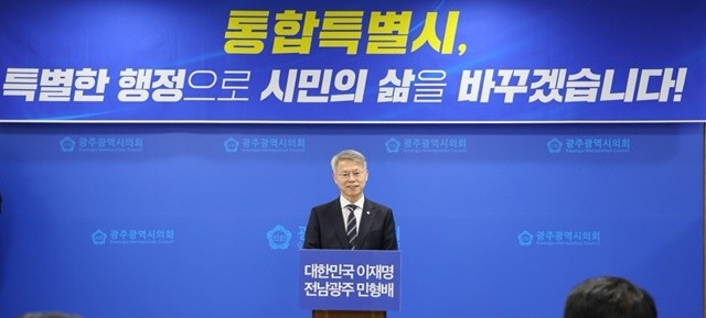 [위키트리 광주전남취재본부 노해섭 기자] 더불어민주당 전남광주통합특별시장 경선 후보인 민형배 국회의원(광주 광산구을)이 7일 오전 광주시의회에서 기자회견을 열고, 통합특별시 행정 운영 구상과 결선 승리 의지를 밝혔다.