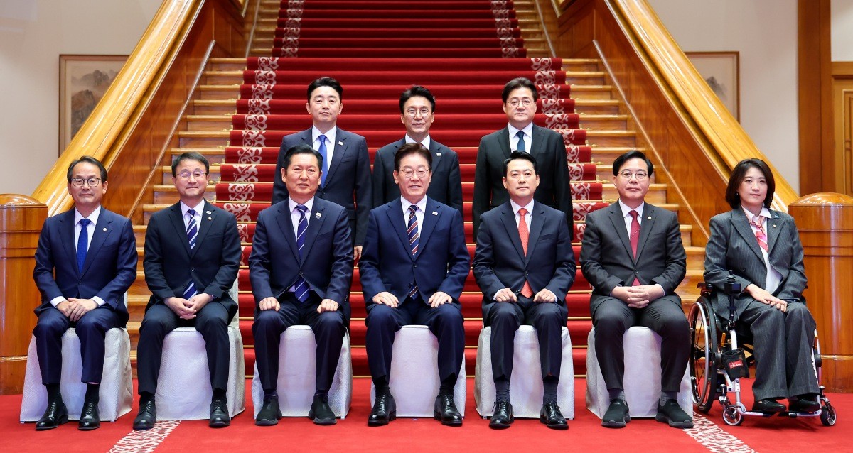 본관 내 계단 앞 기념 촬영 과정에서는 이 대통령의 제안으로 특별한 장면이 연출됐다. 이 대통령은 좌우의 정 대표와 장 대표를 향해 "두 분이 요즘도 손 안 잡고 그러는 것 아니죠. 연습 한 번 해보세요"라고 농담을 던지며 양 대표의 손을 직접 맞잡게 했다. 이어 그 위에 자신의 손을 포개며 협치를 당부했다. 이 모습에 참석자들은 환한 표정으로 화답했으며, 이 대통령과 양당 대표 역시 미소를 지으며 촬영에 임했다.