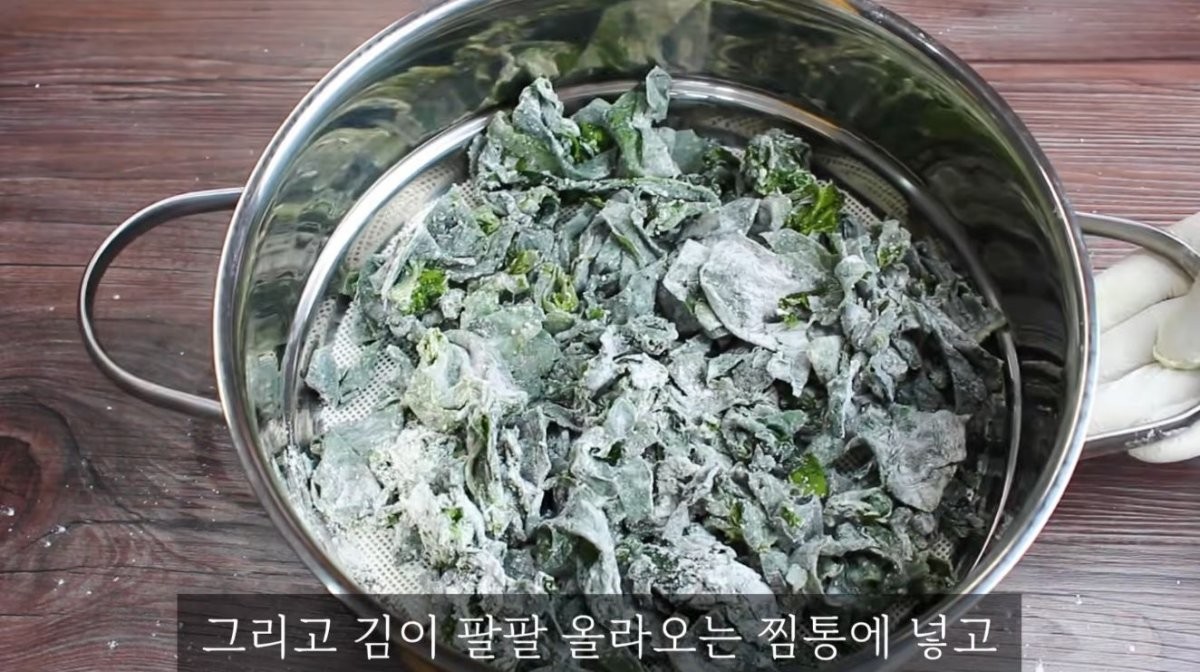 썰어둔 미역을 넉넉한 그릇에 담고 밀가루를 적당히 뿌려가며 겉면을 코팅한다. 미역의 물기 상태에 따라 다르지만 대략 반 컵 정도면 충분하다. 밀가루 코팅은 미역 특유의 비린내를 잡고 식감을 쫄깃하게 만드는 핵심 역할을 한다. 미역이 뭉치지 않고 보슬보슬한 상태가 되면 찜기에 면포를 깔고 미역을 넓게 펼쳐 올린다. 김이 올라오는 찜통에 넣고 센 불에서 딱 6분간 찌면 미역 준비가 완료된다.