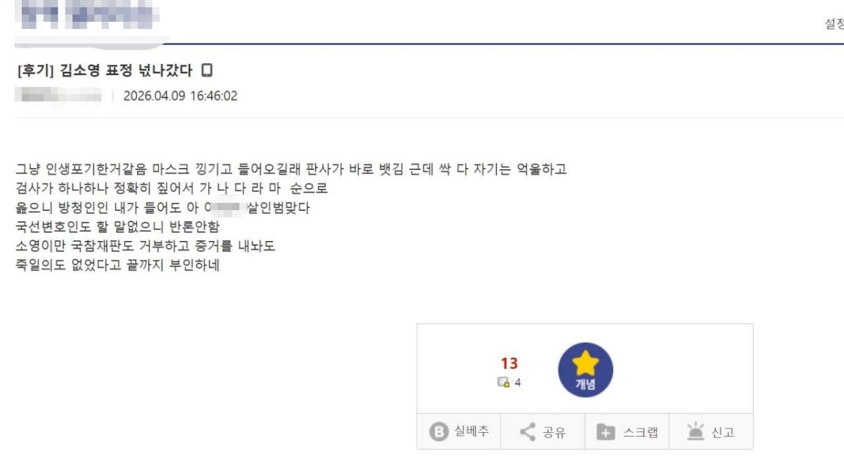 반면 김소영 측 국선 변호인은 약물을 건넨 사실 자체는 인정하면서도 상해를 입히거나 사망에 이르게 할 의도는 없었다는 입장을 밝혔다고 한다. 다만 검찰 측 설명에 대해 별다른 반론은 거의 하지 않았다고 전해졌다. A 씨는 “변호인도 할 말이 없는 듯 보였다”고 적었다.