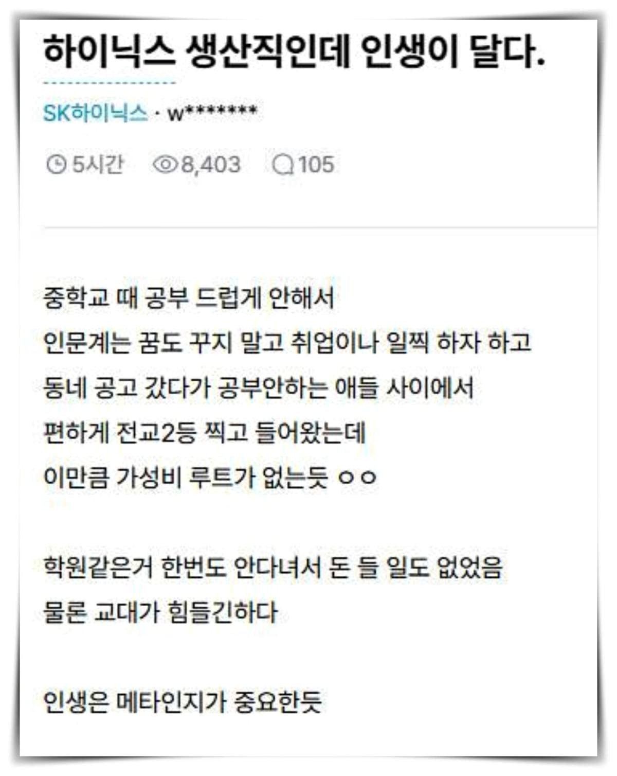 해당 글에 따르면 작성자는 중학교 시절 공부와 담을 쌓은 채 실업계고(공고)에 진학했고, 상대적으로 학업 경쟁이 덜한 환경에서 전교 2등을 기록했다. 그 성적을 발판 삼아 SK하이닉스 생산직에 입사했다는 내용이다. 사교육은 한 번도 받지 않았다고 밝혔다.