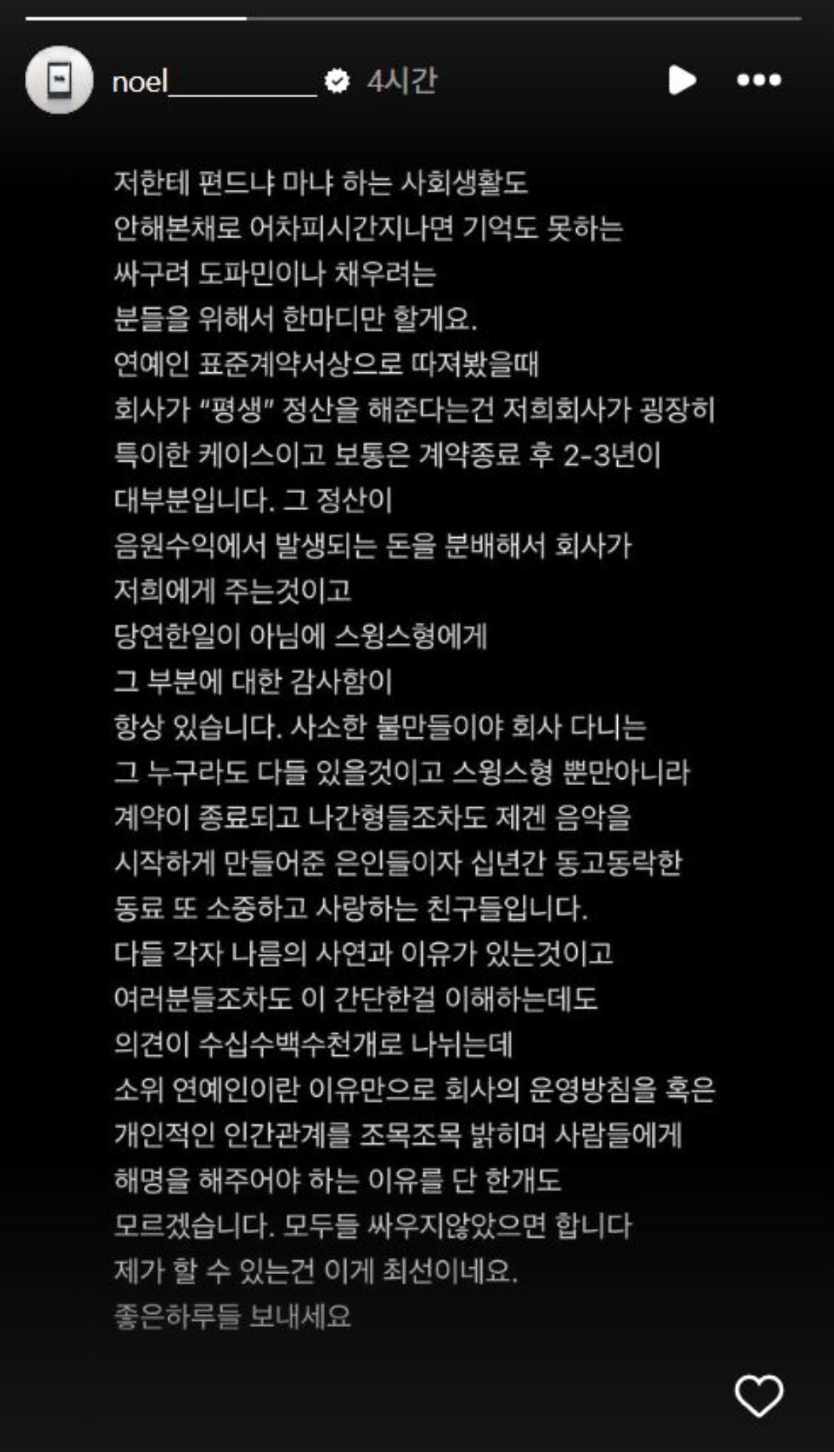 또한 노엘은 연예인이라는 신분 때문에 기업의 운영 방침이나 사적인 인간관계를 일일이 대중에 해명해야 할 필요성을 느끼지 못한다고 선을 그었다. 조직 내에서 발생할 수 있는 소소한 불만은 어느 곳에나 존재할 수 있는 문제이며 스윙스를 비롯해 계약 종료 후 회사를 떠난 동료들 역시 자신에게는 음악적 은인이자 소중한 동료라는 점을 분명히 했다.