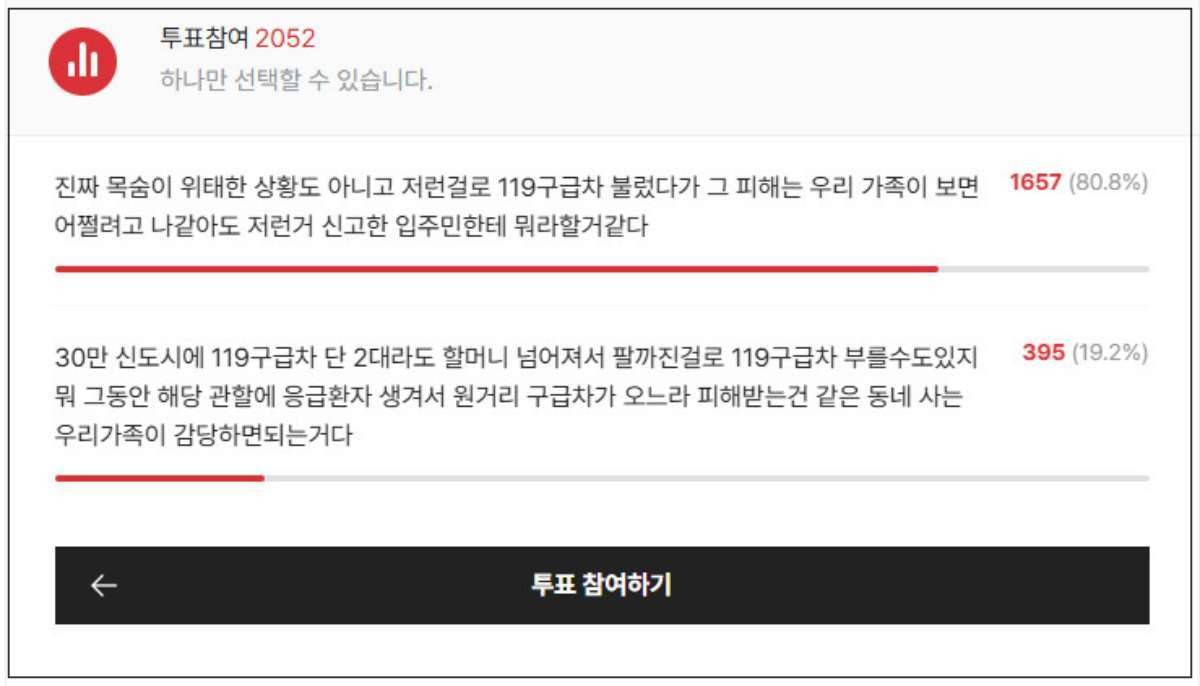 반대로 "30만 신도시에 구급차가 단 2대여도 할머니 팔 까진 걸로 119 부를 수도 있지. 그동안 원거리 구급차가 오느라 피해받는 건 우리 가족이 감당하면 된다"는 선택지를 고른 사람은 395명으로 19.2%에 그쳤다.